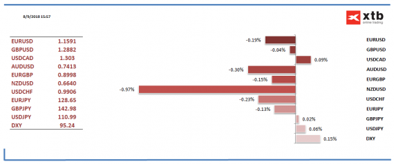 Investory nenechává chladnými ani turecká lira, která dopoledne znovu prohloubila historická minima na páru s americkým dolarem. Pár USDTRY vystoupal až na 5,4478.  K ekonomickým problémům se přidaly zjitřené vztahy mezi USA a Tureckem kvůli zadržování amerického pastora. A ani nová jednání situaci zatím nezvrátilo. Od uvalení sankcí už turecká lira klesla o 8 % a od počátku roku už ztrácí takřka třetinu.