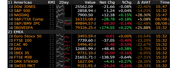 Čtvrteční seance zatím patří k nejlínějším v tomto měsíci. Objemy na některých akciových indexech jsou až čtvrtinu pod třicetidenním klouzavým průměrem. Evropské indexy vykazují lehké ztráty (s výjimkou DAXu). Americké indexy nenabídly hned po otevření trhů jednoznačný směr.