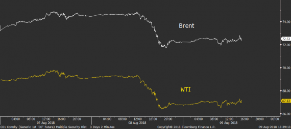 Ropa se v průběhu seance zklidnila po včerejším prudkém výprodeji, který na Brentu i WTI dosáhl až na 4 % a oba hlavní ropné benchmarky poslal na několikatýdenní minima. Včerejšek ukázal, že obchodní války hrají v cenách ropy podstatnou roli a mohou vyvažovat pozitivní dění okolo nových íránských sankcí.