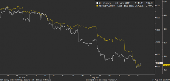 Zajímavé je pak i vývoj na kryptu, které opět trpí. Bitcoin si pohrává s hranicí 6 tis. dolarů, ale ještě více ztrácí ostatní kryptoměny, jako například ethereum, které klesá o 10 %.
