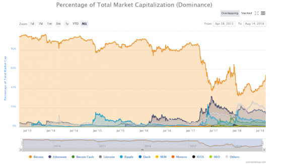 To má za následek pokračující růst podílu BTC na celkovém kryptotrhu, který se vyhoupl už zpět nad hranici 50 %.