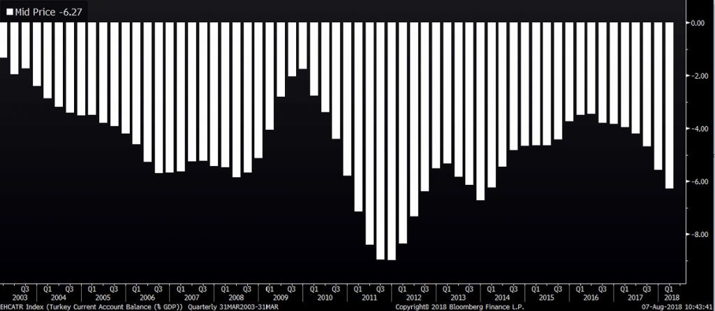 Ešte väčším problémom je rastúci deficit na bežnom účte platobnej bilancie. Ten sa v prvom kvartáli dostal cez 6% HDP. V praxi to znamená, že Turecko dováža viac ako vyváža a je tak závislé na príleve kapitálu zo zahraničia (predovšetkým na úveroch), aby financovalo svoj obchodný deficit. To predstavuje ďalší zdroj predajného tlaku na líru. Ďalším problémom, ktorý tento deficit spôsobuje, je že takto nie je možné fungovať do nekonečna a čím je slabšia líra, tým sú importy nutné pre rast ekonomiky drahšie, čo spomalí ekonomický rast (a teda aj schopnosť generovať cudzie meny z exportov).