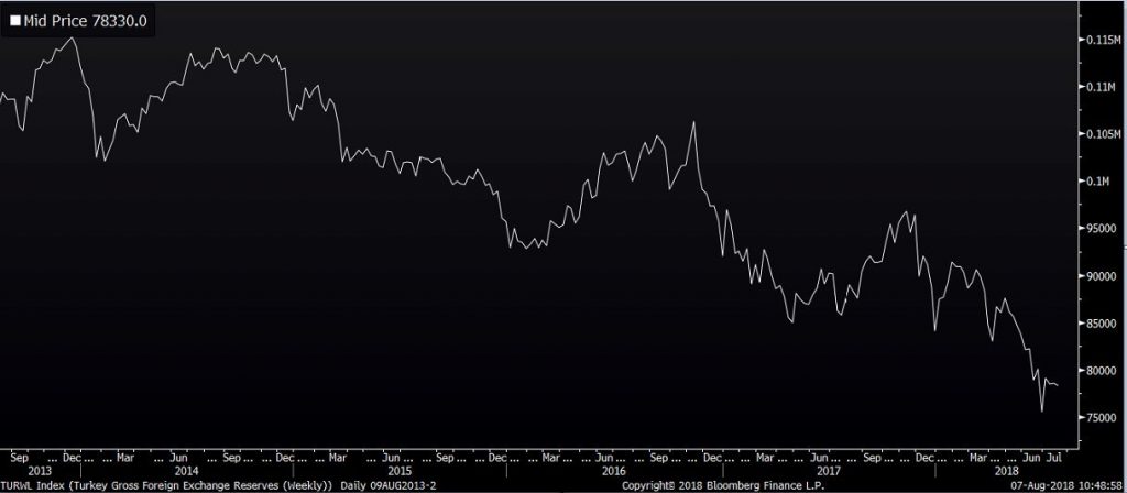 Turecká centrálna banka tlmí dopady týchto efektov predajom devízových rezerv. Jednak ich používa na nákupy lír, teda na posilnenie meny (resp. zmiernenie oslabenia) a zároveň ich poskytuje korporátnej sfére na splácanie dlhu v cudzích menách. Devízové rezervy sa však míňajú. Od jesene minulého roka klesli o zhruba 20% a aktuálne sú na úrovni 78 mld. USD. To je však menej ako korporátny dlh v cudzích menách. Čím menej bude mať Turecko devízových rezerv, tým menej bude mať priestoru pre intervencie na devízových trhoch a na pomoc korporátnej sfére. T.j. s klesajúcimi rezervami sa môže zosilniť predajný tlak na líru.