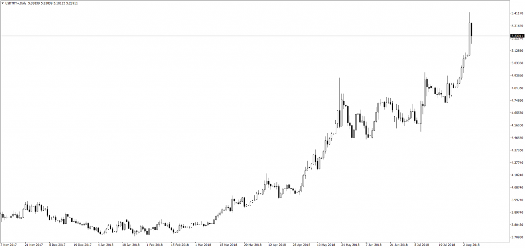 Turecká líra ostáva pod silným tlakom. Ten v posledných dvoch dňoch ešte viac zosilnel, a to po tom, čo USA prišli s odvetnými sankciami za zatknutie amerického pastora. Zatiaľ sa jedná len o finančné sankcie voči dvom ministrom Erdoganovej vlády, začalo sa však hovoriť aj o nových clách voči tureckým exportom. Líra dnes časť strát vymazala po správach, že sa chystajú rokovania medzi USA a Tureckom, ktoré by mohli zmierniť napätie.