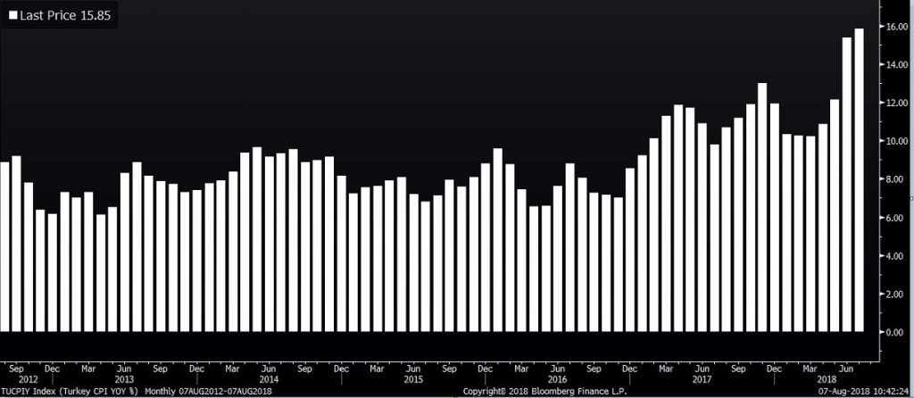 Začnime infláciou. Tá sa vyšplhala na 16%, čo je v aktuálnej situácii, kedy má väčšina sveta, a nielen západného, problém s infláciou pod inflačným cieľom, výnimočná situácia. Turecko je aktuálne najväčšou ekonomikou, ktorá čelí dvojpercentnej inflácii. A ceny pôjdu zrejme ešte vyššie, keďže líra od júna (za ktorý je k dispozícii posledné inflačné číslo) oslabila, predražia sa totiž importy. Vysoká inflácia jednak znižuje atraktivitu investícií do ekonomiky (dopyt po líre je teda nižší) a navyše tlačí domácich obyvateľov k tomu, aby si ukladali úspory v iných menách (rastie ponuka lír). Vysoká inflácia teda zvyšuje predajný tlak na líru.