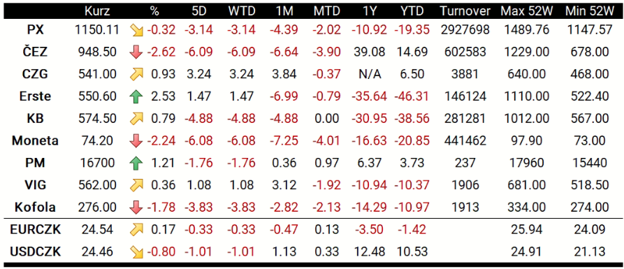Kurzy indexu PX a jednotlivých akcií po uzavření BCPP v pátek 2.9.2022. Zdroj: Bloomberg