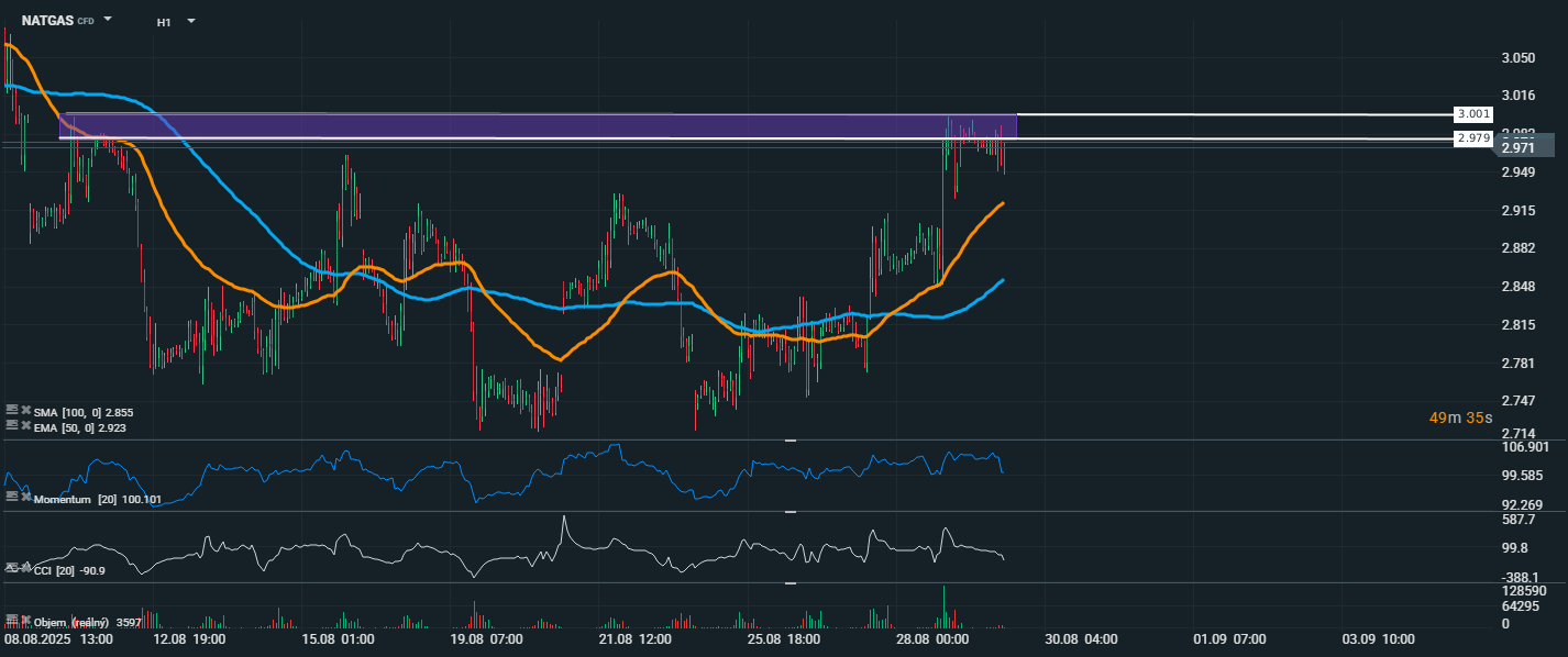 Cena zemného plynu sa pohybuje okolo úrovne 2,97 USD/MMBtu, pričom testuje kľúčovú rezistenčnú zónu medzi 2,979–3,001 USD/MMBtu, ktorá je zvýraznená fialovým pásmom. Táto oblasť predstavuje silnú technickú prekážku, kde trh už viackrát zlyhal v prerazení.