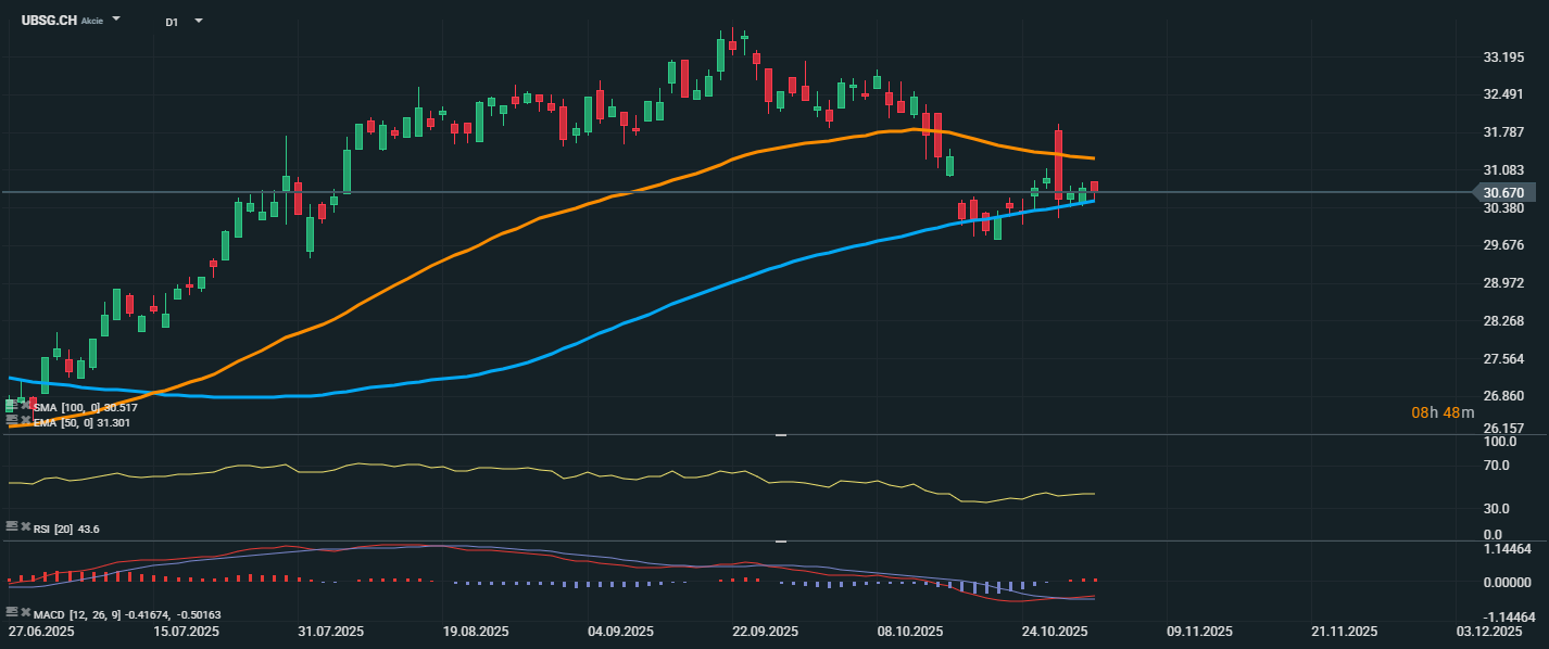 Akcie švajčiarskej banky UBS sa po období poklesu stabilizovali okolo úrovne 30,67 CHF, kde sa nachádza aj kľúčová technická zóna – kĺzavý priemer SMA 100 (30,52 CHF). Cena sa aktuálne pohybuje tesne pod 50-denným EMA (31,30 CHF), čo predstavuje dôležitú krátkodobú rezistenciu. RSI na úrovni 43,6 naznačuje slabé momentum a ukazuje, že trh zatiaľ neprejavuje silný nákupný záujem.