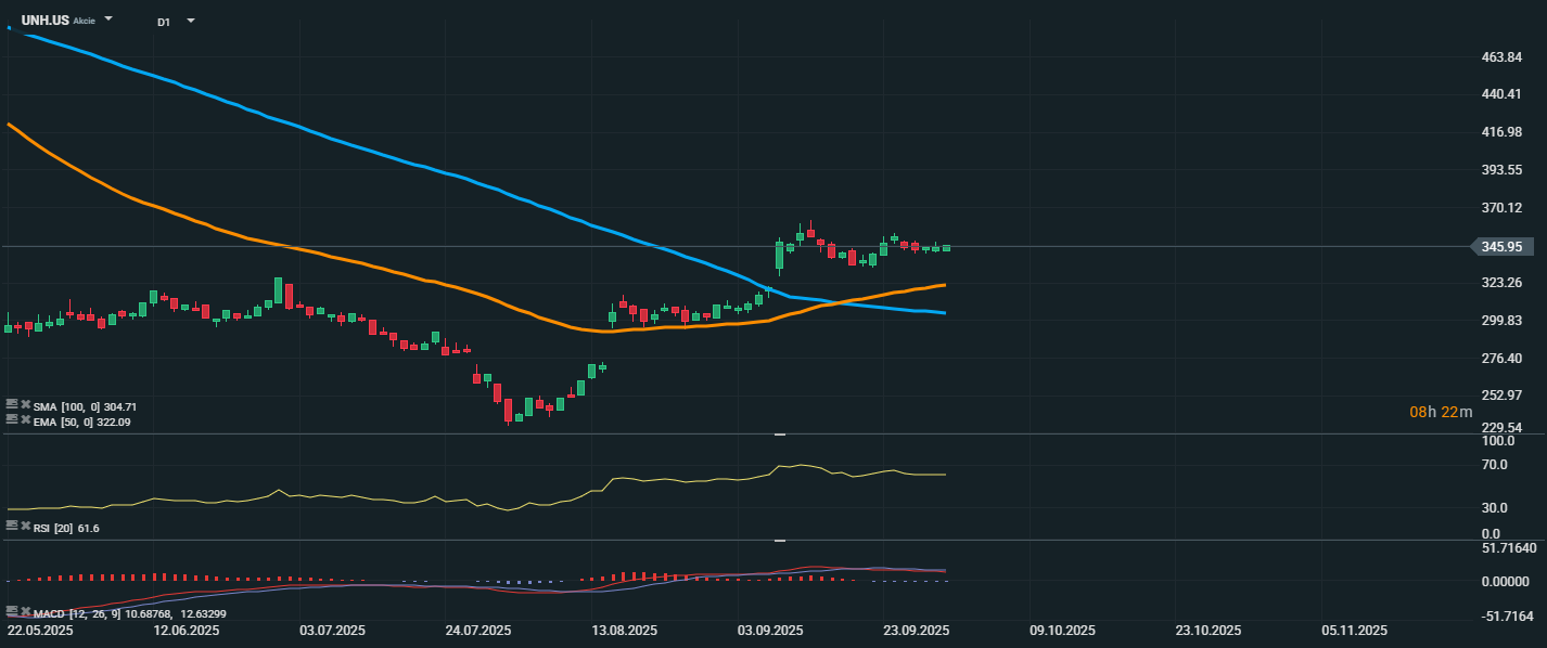 Akcie spoločnosti UnitedHealth Group (UNH) sa stabilizovali v úzkom pásme okolo úrovne 345,95 USD. Technická situácia sa zlepšila, keď cena prerazila nad kĺzavé priemery EMA 50 (322,09 USD) a SMA 100 (304,71 USD), ktoré teraz fungujú ako dôležité podpory. RSI na hodnote 61,6 naznačuje, že kupujúci majú prevahu, no trh sa zatiaľ neprehieva.