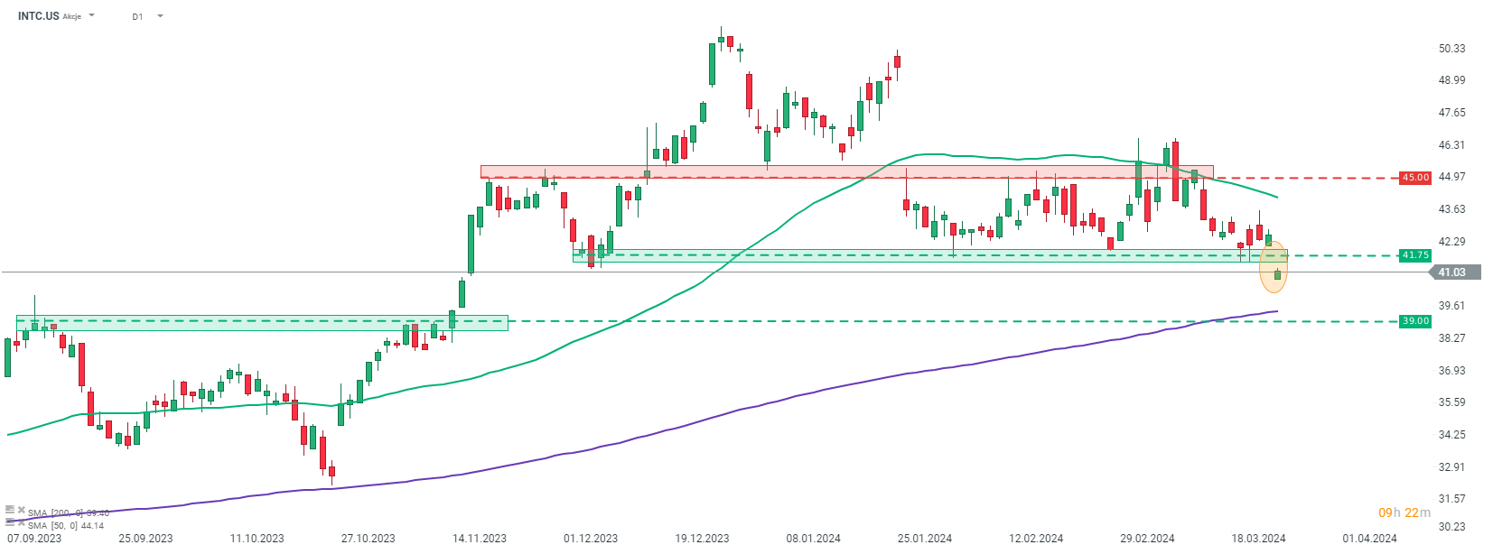 Intel (INTC.US) dnes klesá o viac ako 3 % a prekonáva podpornú zónu 41,75 USD. Akcie sa obchodujú na najnižšej úrovni od polovice novembra 2023. Ďalšiu sledovanú podporu možno nájsť v oblasti 39 USD. Zdroj: xStation5