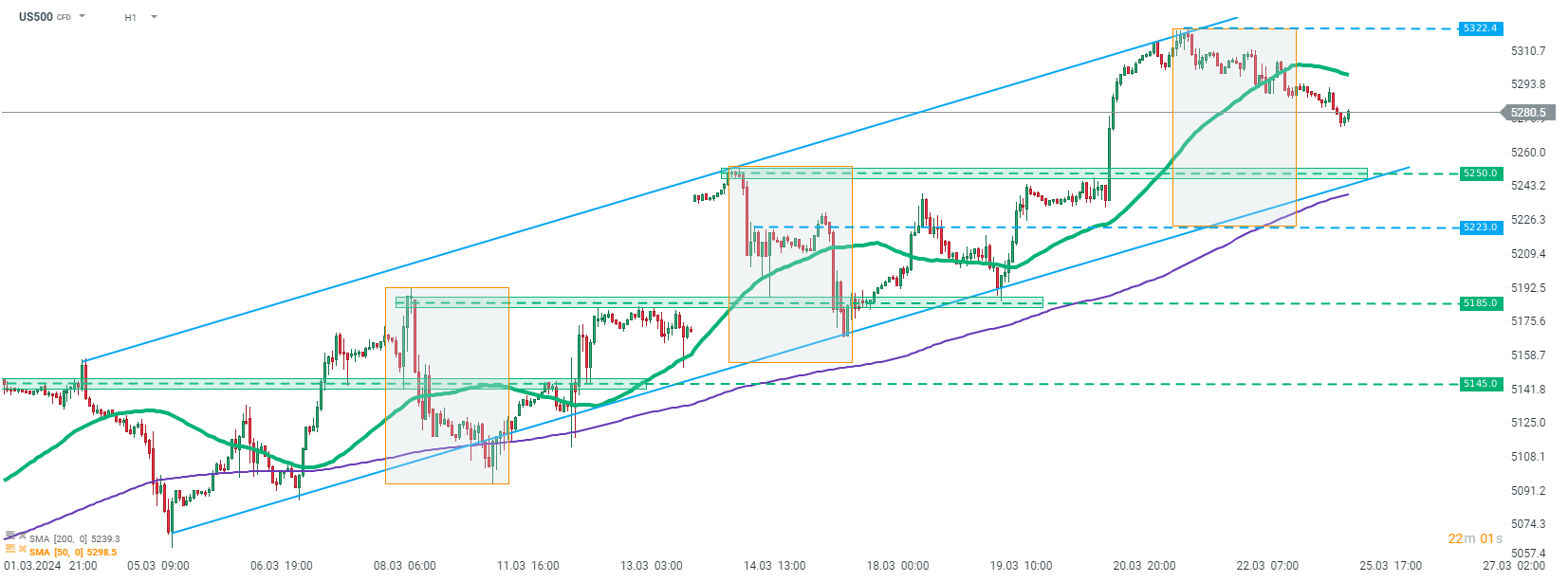 Futures na S&P 500 (US500) naďalej ustupujú z nedávnych historických maxím. Pri pohľade na graf v intervale H1 vidíme, že boli dosiahnuté v blízkosti hornej hranice krátkodobého býčieho kanála. Index sa stiahol späť pod 50-hodinový kĺzavý priemer (zelená čiara) a kľúčový krátkodobý support, ktorý treba sledovať, sa nachádza v oblasti 5 250 bodov, vyznačenej predchádzajúcimi cenovými reakciami a dolnou hranicou kanála.