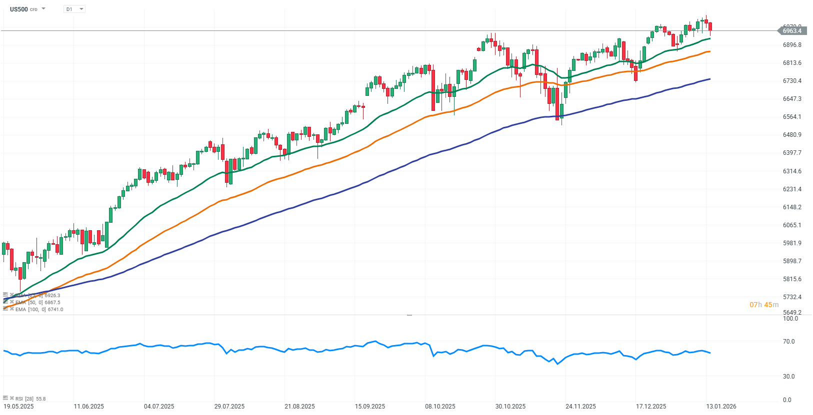 US500 oslabuje po vyššom než očakávanom PPI – trh prehodnocuje očakávania ohľadom sadzieb Fedu. Futures na US500 (S&P 500) dnes oslabujú v porovnaní so včerajším uzavretím, najmä v reakcii na vyšší než očakávaný index PPI, čo poukazuje na pretrvávajúce inflačné tlaky a znižuje očakávania trhu na rýchle zníženie sadzieb zo strany Fedu. Jadrový PPI nad konsenzom vyvolal obavy z pokračovania aktuálnej menovej politiky. Indikátor RSI klesá k úrovni 50, čo signalizuje neutrálne momentum a možnosť ďalšej korekcie po decembrových rekordoch.
