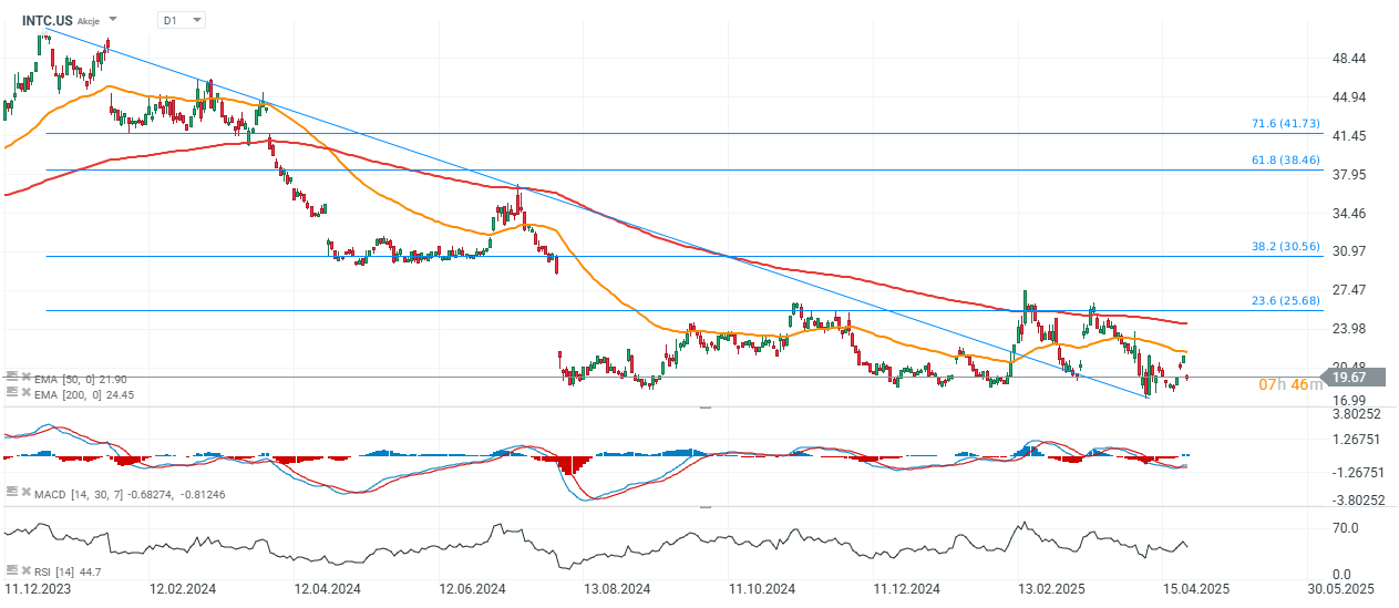 Akcie Intelu dnes klesajú pod hranicu 20 USD, čo predstavuje 8 % pokles. Akcia sa nedokázala dostať nad 23,6% Fibonacciho retracement poslednej klesajúcej vlny a dvakrát neudržala úroveň nad 200-dňovým EMA, čo signalizuje návrat do downtrendu.