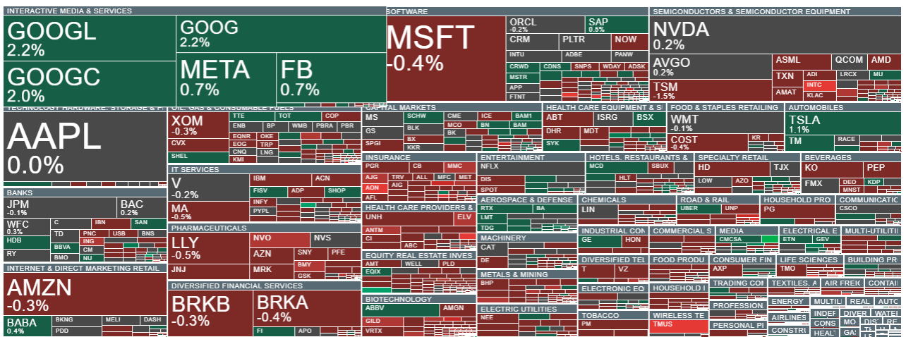Nálada medzi americkými akciovými indexmi je dnes zmiešaná. US100 sa snaží dostať späť do zelených čísel, zatiaľ čo US30 stráca viac ako 0,4 %. Medzi technologickými gigantmi dnes zaznamenávajú najväčšie zisky Alphabet (GOOGL.US) a Tesla (TSLA.US).