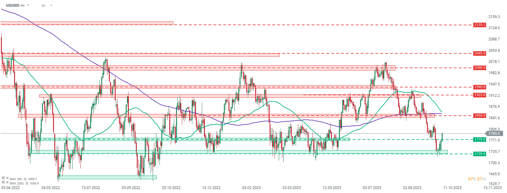 Russell 2000 (US2000) sa po nedávnom prepade naďalej zotavuje. Index sa odrazil od podpornej zóny 1 730 bodov a dokázal sa prelomiť späť nad swingovú oblasť 1 775 bodov. Ďalší hlavný odpor k sledovaniu možno nájsť v oblasti 1 850 bodov a je označený predchádzajúcou cenovou reakciou, rovnako ako kĺzavými priemermi 50 a 200 sedení. Vzhľadom na to, že spomínaná podpora 1 730 bodov funguje ako spodná hranica širokého obchodného rozpätia, reakcia na strane dopytu na túto prekážku signalizuje, že môže nasledovať posun smerom k hornej hranici 2 000 bodov.