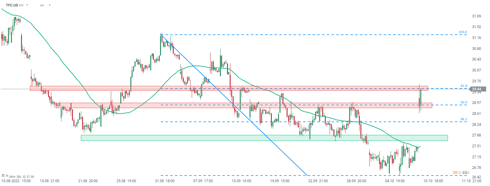 Spoločnosť Truist Financial (TFC.US) začala dnešné obchodovanie s veľkým býčím cenovým rozdielom po správach o predaji poisťovacej maklérskej jednotky. Akcie vymazali viac ako polovicu nedávneho poklesu a obchodujú sa na najvyššej úrovni za mesiac. Zdroj: xStation5