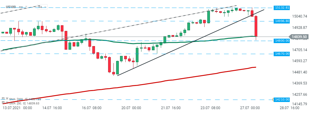 US100 sa prelomil pod stúpajúcu trendovú čiaru a v súčasnosti testuje podporu na hodnote 14 800 bodov, ktorá je navyše posilnená o 50 SMA (zelená čiara). Zdroj: xStation5