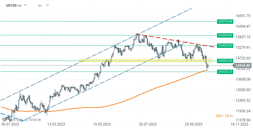 Kontrakty na US100 si v priebehu dňa pripísali 1 % a obchodujú sa v zóne medzi 200-dňovým exponenciálnym kĺzavým priemerom (zlatá krivka) a 61,8 % Fibonacciho retracementom klesajúceho trendu, ktorý sa začal v novembri 2021. Zdroj: xStation