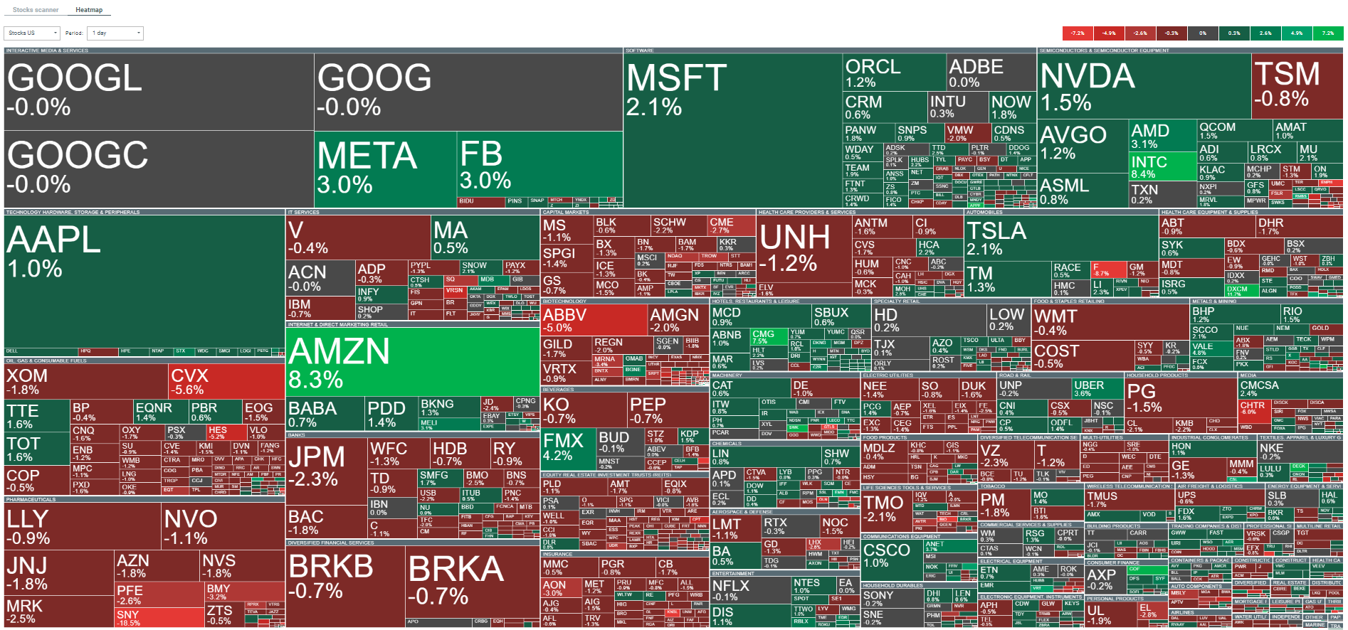 Ak sa pozrieme na všetky spoločnosti na americkom trhu, najväčšie vnútrodenné nárasty sa opäť pripisujú megakapitalizáciám, t. j. spoločnostiam s najvyššou trhovou kapitalizáciou. Medzi týmito spoločnosťami dnes vyniká Amazon (AMZN.US), ktorý si po zverejnení výsledkov pripísal viac ako 8,6 %. Zdroj: xStation