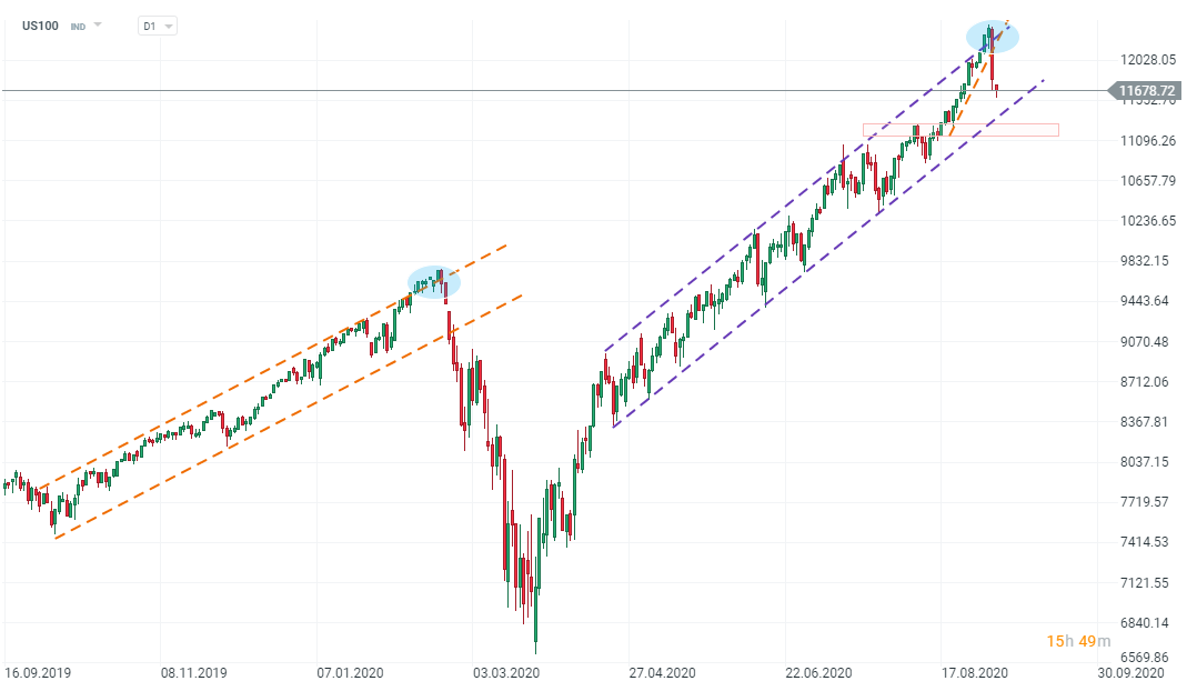 Vysoké ocenenie je teraz charakteristické pre celý technologický sektor, preto niet divu, že US100 zaznamenal najvýraznejší pokles. Čo bude ďalej? Index je stále veľmi vysoko a vo veľmi strmom rastovom kanály. Dolná hranica tohto kanála je okolo úrovne 11 450 bodov, zatiaľ čo predchádzajúce lokálne maximum je okolo úrovne 11 265 bodov - jedná sa o úroveň podpory, ktorú je potrebné sledovať.