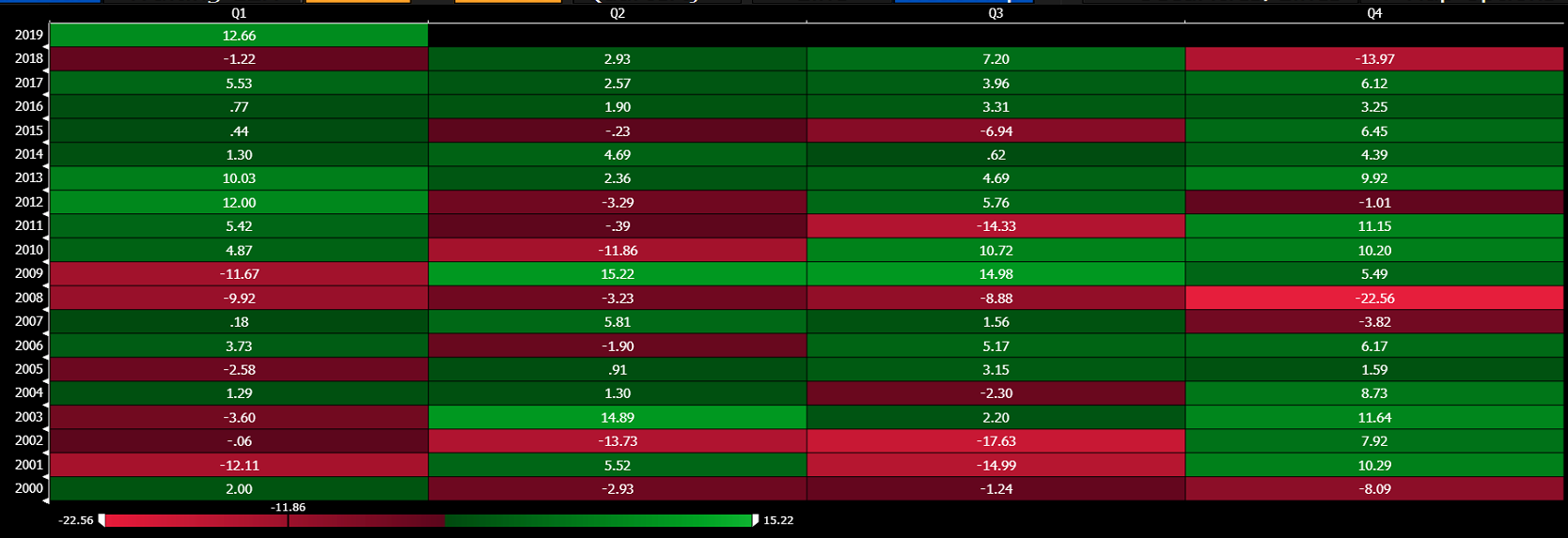 Prehľad výkonnosti (v percentách) akciového indexu S&P 500 v jednotlivých kvartáloch za posledných 20 rokov. Zdroj: Bloomberg