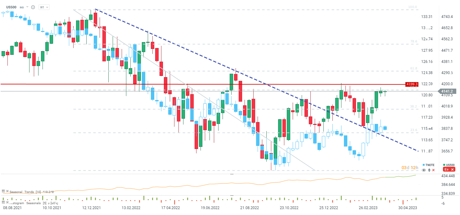 US500 se obchoduje v blízkosti klíčové zóny odporu mezi 50 % retracementem klesajícího pohybu zahájeného v loňském roce a hranicí 4 200 bodů. Volatilita je omezená a americké výnosy obnovily vzestup, což naznačuje možný obrat. US500 však bude v následujících hodinách a dnech zranitelný i vůči dalším událostem, jako je zveřejnění zápisu z jednání FOMC nebo výsledky hospodaření amerických bank. Zdroj: xStation5