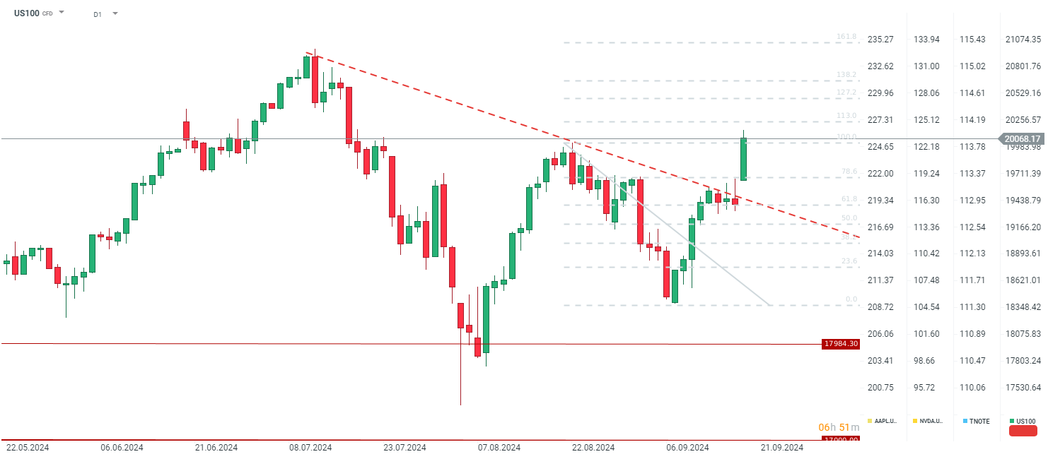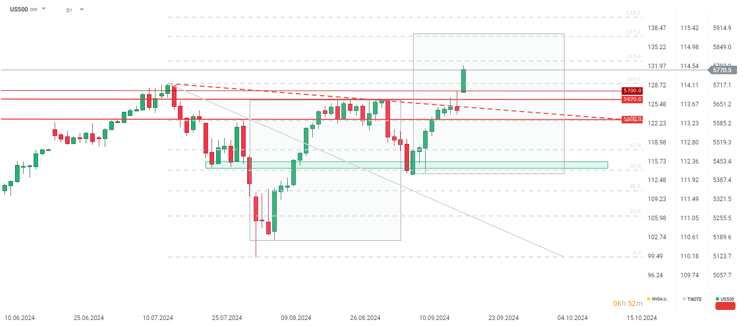 Obrat bol približne 50 bodov. Aj bez tohto preklopenia by bol US500 na nových historických maximách. Včera sme boli svedkami vyberania ziskov po konferencii Fedu, ale dnes sme svedkami pokračovania silného odrazu, ktorý sa začal 9. septembra. Kľúčovou zónou podpory zostáva oblasť okolo 5 670 - 5 700 bodov. Úrovne odporu zahŕňajú 5 805 bodov na úrovni 113,0 Fibonacciho retracementu a 5 900 bodov na úrovni 127,2 Fibonacciho retracementu. Na tejto úrovni nájdeme aj rozsah predchádzajúcej vzostupnej vlny.