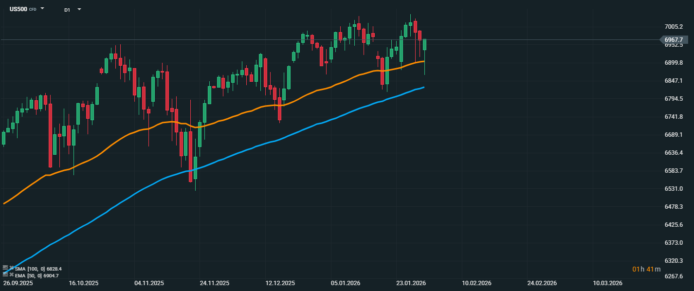 Futures na index S&P 500 (US500) rýchlo prekonali 50-dňový kĺzavý priemer EMA na dennom grafe a opäť sa pohybujú v blízkosti úrovne 6 950 bodov. Silný výsledkový momentum naďalej podporuje býčiu náladu a pomáha vyvažovať negatívne impulzy z hľadiska momenta.