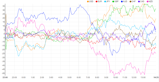 Z grafu níže je zřetelné, že nejsilnějšími měnami jsou dnes USD a GBP, naopak nejméně se daří NZD a EUR.