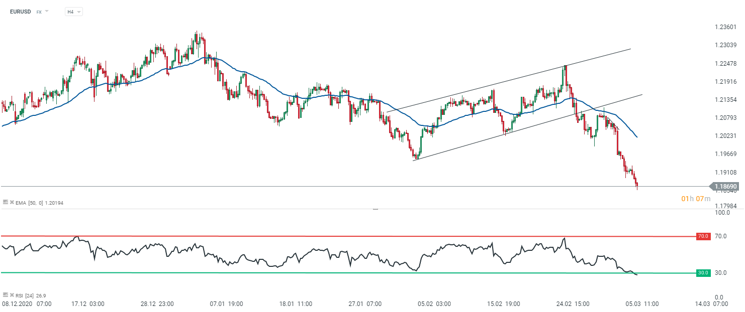 Při pohledu na 4 hodinový časový rámec eurodolaru je zřetelné, že cena prorazila pod rostoucí kanál a vytvořila nové dno. Oscilátor RSI ukazuje známky přeprodanosti. Mohl by tak předpovídat obrat, i když v silných trendech mohou oscilátory selhávat.