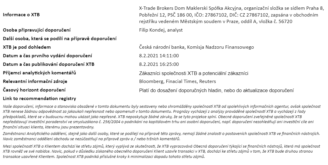 Tento materiál je marketingovou komunikáciou v zmysle čl. 24 ods. 3 smernice Európskeho parlamentu a Rady 2014/65/EÚ z 15. mája 2014 o trhoch s finančnými nástrojmi, ktorou sa mení smernica 2002/92/ES a smernica 2011/61/EÚ (MiFID II). Marketingová komunikácia nie je investičným odporúčaním ani informáciou odporúčajúcou alebo navrhujúcou investičnú stratégiu v zmysle nariadenia Európskeho parlamentu a Rady (EÚ) č. 596/2014 zo 16. apríla 2014 o zneužívaní trhu (nariadenie o zneužívaní trhu) a o zrušení smernice Európskeho parlamentu a Rady 2003/6/ES a smerníc Komisie 2003/124/ES, 2003/125/ES a 2004/72/ES a delegovaného nariadenia Komisie (EÚ) 2016/958 z 9. marca 2016, ktorým sa dopĺňa nariadenie Európskeho parlamentu a Rady (EÚ) č. 596/2014, pokiaľ ide o regulačné technické predpisy upravujúce technické opatrenia na objektívnu prezentáciu investičných odporúčaní alebo iných informácií, ktorými sa odporúča alebo navrhuje investičná stratégia, a na zverejňovanie osobitných záujmov alebo uvádzanie konfliktov záujmov v zmysle zákona č. 566/2001 Z. z. o cenných papieroch a investičných službách. Marketingová komunikácia je pripravená s najvyššou starostlivosťou, objektivitou, prezentuje fakty známe autorovi k dátumu prípravy a neobsahuje žiadne hodnotiace prvky. Marketingová komunikácia je pripravená bez zohľadnenia potrieb klienta, jeho individuálnej finančnej situácie a nijakým spôsobom nepredstavuje investičnú stratégiu. Marketingová komunikácia nepredstavuje ponuku na predaj, ponuku, predplatné, výzvu na nákup, reklamu alebo propagáciu akýchkoľvek finančných nástrojov. XTB S.A. organizačná zložka nezodpovedá za žiadne kroky alebo opomenutia klienta, najmä za nadobudnutie alebo predaj finančných nástrojov. XTB nezodpovedá za žiadnu stratu alebo škodu, vrátane, bez obmedzenia, akejkoľvek straty, ktorá môže vzniknúť priamo alebo nepriamo, spôsobená na základe informácií obsiahnutých v tejto marketingovej komunikácii. V prípade, že marketingová komunikácia obsahuje akékoľvek informácie o akýchkoľvek výsledkoch týkajúcich sa finančných nástrojov v nej uvedených, nepredstavujú žiadnu záruku ani prognózu budúcich výsledkov. Minulá výkonnosť nemusí nevyhnutne naznačovať budúce výsledky a každá osoba konajúca na základe týchto informácií tak robí výlučne na vlastné riziko.