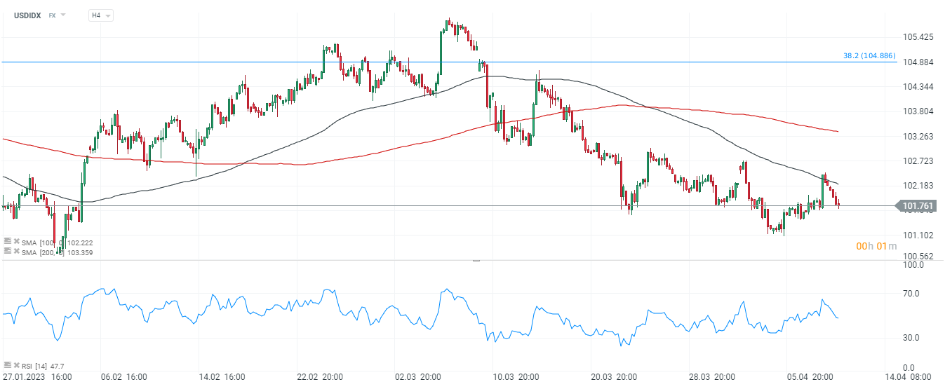 USDIDX graf, H4 interval. Dolarový index reagoval poklesem pod úroveň 38,2 Fibonacciho retracementu vlny započaté v 1. čtvrtletí 2021, do blízkosti 105 bodů. Od poloviny března, kdy se investoři dozvěděli o rozsahu problémů bankovního sektoru, měli býci jasný problém s růstem nad SMA100 (černá linie). Zdroj: xStation5