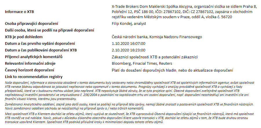 Tento materiál je marketingovou komunikáciou v zmysle čl. 24 ods. 3 smernice Európskeho parlamentu a Rady 2014/65/EÚ z 15. mája 2014 o trhoch s finančnými nástrojmi, ktorou sa mení smernica 2002/92/ES a smernica 2011/61/EÚ (MiFID II). Marketingová komunikácia nie je investičným odporúčaním ani informáciou odporúčajúcou alebo navrhujúcou investičnú stratégiu v zmysle nariadenia Európskeho parlamentu a Rady (EÚ) č. 596/2014 zo 16. apríla 2014 o zneužívaní trhu (nariadenie o zneužívaní trhu) a o zrušení smernice Európskeho parlamentu a Rady 2003/6/ES a smerníc Komisie 2003/124/ES, 2003/125/ES a 2004/72/ES a delegovaného nariadenia Komisie (EÚ) 2016/958 z 9. marca 2016, ktorým sa dopĺňa nariadenie Európskeho parlamentu a Rady (EÚ) č. 596/2014, pokiaľ ide o regulačné technické predpisy upravujúce technické opatrenia na objektívnu prezentáciu investičných odporúčaní alebo iných informácií, ktorými sa odporúča alebo navrhuje investičná stratégia, a na zverejňovanie osobitných záujmov alebo uvádzanie konfliktov záujmov v zmysle zákona č. 566/2001 Z. z. o cenných papieroch a investičných službách. Marketingová komunikácia je pripravená s najvyššou starostlivosťou, objektivitou, prezentuje fakty známe autorovi k dátumu prípravy a neobsahuje žiadne hodnotiace prvky. Marketingová komunikácia je pripravená bez zohľadnenia potrieb klienta, jeho individuálnej finančnej situácie a nijakým spôsobom nepredstavuje investičnú stratégiu. Marketingová komunikácia nepredstavuje ponuku na predaj, ponuku, predplatné, výzvu na nákup, reklamu alebo propagáciu akýchkoľvek finančných nástrojov. XTB S.A. organizačná zložka nezodpovedá za žiadne kroky alebo opomenutia klienta, najmä za nadobudnutie alebo predaj finančných nástrojov. XTB nezodpovedá za žiadnu stratu alebo škodu, vrátane, bez obmedzenia, akejkoľvek straty, ktorá môže vzniknúť priamo alebo nepriamo, spôsobená na základe informácií obsiahnutých v tejto marketingovej komunikácii. V prípade, že marketingová komunikácia obsahuje akékoľvek informácie o akýchkoľvek výsledkoch týkajúcich sa finančných nástrojov v nej uvedených, nepredstavujú žiadnu záruku ani prognózu budúcich výsledkov. Minulá výkonnosť nemusí nevyhnutne naznačovať budúce výsledky a každá osoba konajúca na základe týchto informácií tak robí výlučne na vlastné riziko.