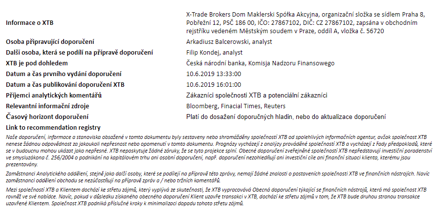 Tento materiál je marketingovou komunikáciou v zmysle čl. 24 ods. 3 smernice Európskeho parlamentu a Rady 2014/65/EÚ z 15. mája 2014 o trhoch s finančnými nástrojmi, ktorou sa mení smernica 2002/92/ES a smernica 2011/61/EÚ (MiFID II). Marketingová komunikácia nie je investičným odporúčaním ani informáciou odporúčajúcou alebo navrhujúcou investičnú stratégiu v zmysle nariadenia Európskeho parlamentu a Rady (EÚ) č. 596/2014 zo 16. apríla 2014 o zneužívaní trhu (nariadenie o zneužívaní trhu) a o zrušení smernice Európskeho parlamentu a Rady 2003/6/ES a smerníc Komisie 2003/124/ES, 2003/125/ES a 2004/72/ES a delegovaného nariadenia Komisie (EÚ) 2016/958 z 9. marca 2016, ktorým sa dopĺňa nariadenie Európskeho parlamentu a Rady (EÚ) č. 596/2014, pokiaľ ide o regulačné technické predpisy upravujúce technické opatrenia na objektívnu prezentáciu investičných odporúčaní alebo iných informácií, ktorými sa odporúča alebo navrhuje investičná stratégia, a na zverejňovanie osobitných záujmov alebo uvádzanie konfliktov záujmov v zmysle zákona č. 566/2001 Z. z. o cenných papieroch a investičných službách. Marketingová komunikácia je pripravená s najvyššou starostlivosťou, objektivitou, prezentuje fakty známe autorovi k dátumu prípravy a neobsahuje žiadne hodnotiace prvky. Marketingová komunikácia je pripravená bez zohľadnenia potrieb klienta, jeho individuálnej finančnej situácie a nijakým spôsobom nepredstavuje investičnú stratégiu. Marketingová komunikácia nepredstavuje ponuku na predaj, ponuku, predplatné, výzvu na nákup, reklamu alebo propagáciu akýchkoľvek finančných nástrojov. XTB S.A. organizačná zložka nezodpovedá za žiadne kroky alebo opomenutia klienta, najmä za nadobudnutie alebo predaj finančných nástrojov. XTB nezodpovedá za žiadnu stratu alebo škodu, vrátane, bez obmedzenia, akejkoľvek straty, ktorá môže vzniknúť priamo alebo nepriamo, spôsobená na základe informácií obsiahnutých v tejto marketingovej komunikácii. V prípade, že marketingová komunikácia obsahuje akékoľvek informácie o akýchkoľvek výsledkoch týkajúcich sa finančných nástrojov v nej uvedených, nepredstavujú žiadnu záruku ani prognózu budúcich výsledkov. Minulá výkonnosť nemusí nevyhnutne naznačovať budúce výsledky a každá osoba konajúca na základe týchto informácií tak robí výlučne na vlastné riziko.