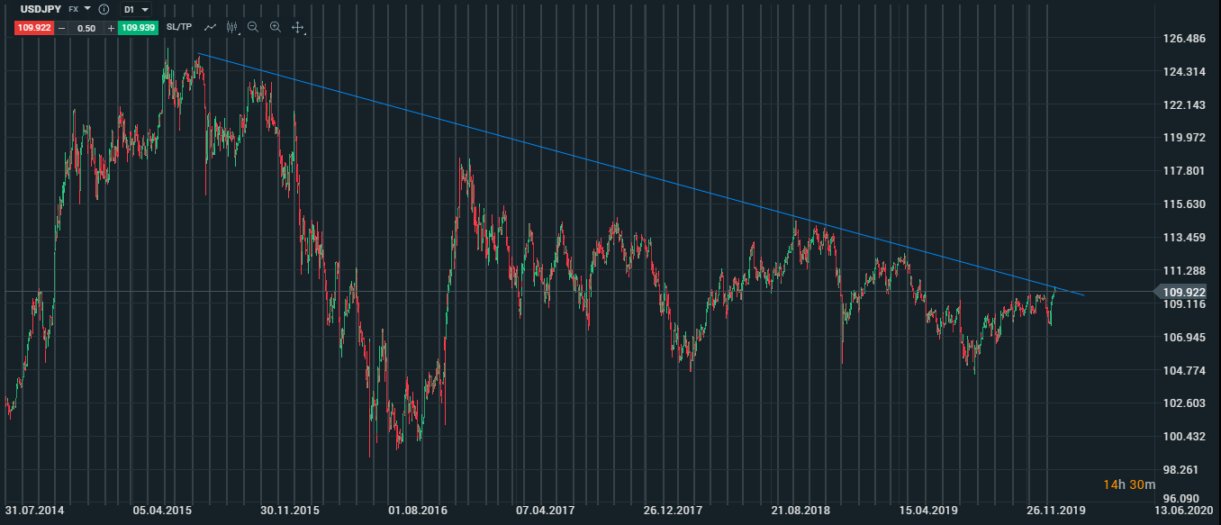 USDJPY na hraně klesající trendové linky z roku 2015. Zdroj: xStation5