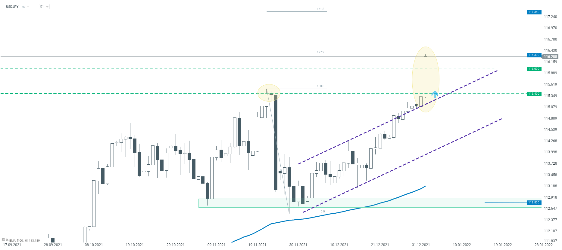 Začiatkom nového roka dominujú rizikové nálady na svetových akciových trhoch. Indexy z Európy a Spojených štátov vykazujú solídne zisky už druhý deň po sebe. Zlepšená nálada a zvýšená chuť riskovať majú negatívny vplyv na japonský jen, tradičnú menu bezpečného prístavu. Medzitým skok v amerických výnosoch podporuje americký dolár. V dôsledku toho je dnes možné zaznamenať silný pohyb na USDJPY smerom nahor.