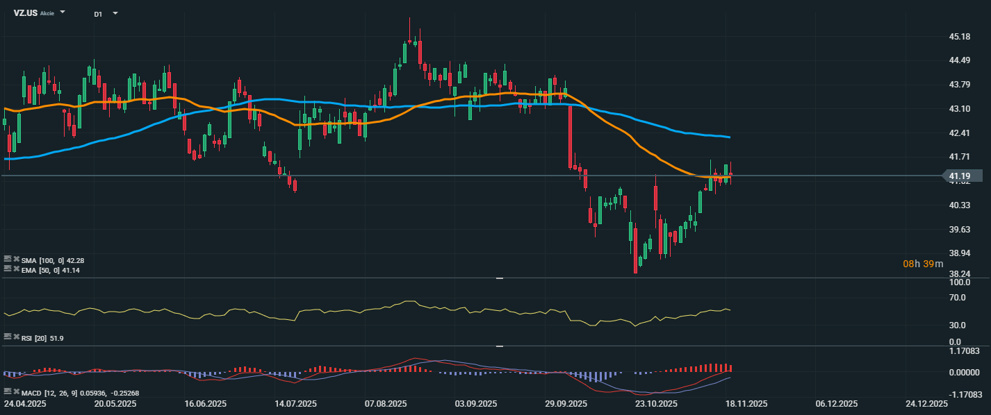 Akcie spoločnosti Verizon sa aktuálne obchodujú na úrovni 41,19 USD a pohybujú sa v blízkosti EMA 50 (41,14 USD). Cena sa však stále nachádza pod SMA 100 (42,28 USD), čo naznačuje, že strednodobý trend zostáva negatívny, aj keď krátkodobo dochádza k zlepšeniu. Po výraznom prepade z prelomu septembra a októbra sa akcie zotavujú a vytvárajú rastovú sériu vyšších miním a maxím. Technické indikátory podporujú tento obrat: RSI sa nachádza na úrovni 51,9, teda v neutrálnej zóne, čo naznačuje priestor pre ďalší rast bez známok prekúpenosti.