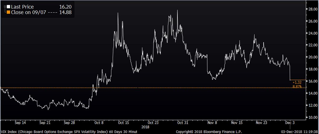 Vidina možnosti zmiernenia globálneho obchodného napätia je už druhou pozitívnou správou z posledných dní. To ďalšou je pootvorenie si dvierok zo strany šéfa FEDu Powella k pomalšiemu zvyšovaniu úročenia v prípade, že sa ekonomika zhorší. Dva najhorúcejšie faktory, ktoré stáli za výpredajmi na trhoch (obavy o dopady obchodných vojen a rastu úročenia v USA), tak čiastočne opadli, čo malo za následok zmiernenie napätia. Index VIX klesol na najnižšiu úroveň od prvej zo štyroch vĺn výpredajov, z 10. októbra. A pokiaľ Trump v najbližších dňoch dohodu na twittri neodvolá, tak VIX môže ísť pokojne nižšie.