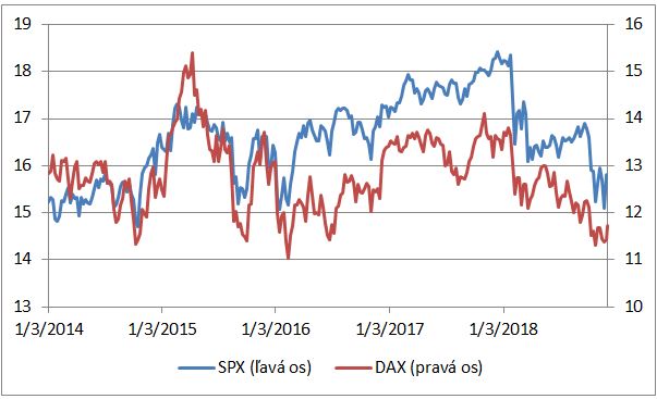 Vývoj ocenenia (pomer ceny k očakávaným ročným ziskom) indexov S&P 500 a DAX