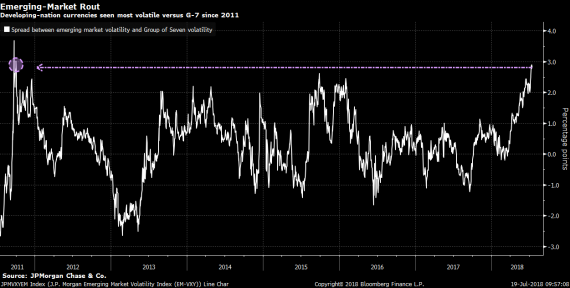 Jedna zajímavost pro ty z vás, kteří se poslední dobou zaměřují na měny emerging markets (EM) zemí. Poměrně značný výprodej, kterým si většina měn v tomto koši prochází, zanechává stopu také na úrovni implikované volatility. Ta v minulých týdnech výrazně vzrostla a v porovnání s volatilitou sedmi nejvíce obchodovaných měn je rozdíl mezi majors a EM měnami na FX nejvyšší od začátku evropské dluhové krize z roku 2011. Spread se nyní začíná přibližovat úrovni tří procentních bodů. Cena zajištění proti cenovým výkyvům se tak v EM regionu zvyšuje, což není dobrá zpráva zejména pro zahraniční firmy, které v problematických zemích podnikají a vyvádí zisky například ve formě dividend.