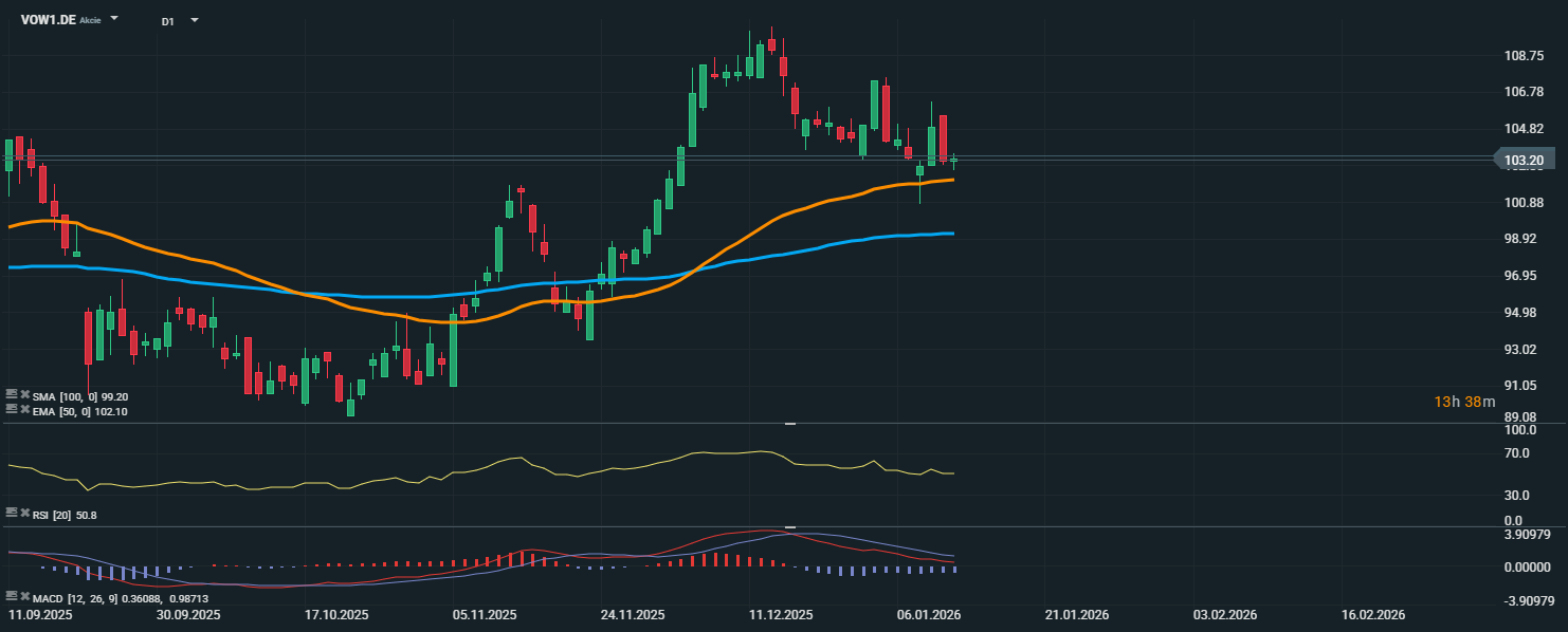 Akcie spoločnosti Volkswagen sa aktuálne obchodujú na úrovni 103,20 EUR a v posledných dňoch sa držia v úzkom pásme okolo tejto hodnoty. Cena sa nachádza nad kĺzavými priemermi EMA 50 (102,10 EUR) aj SMA 100 (99,20 EUR), čo naznačuje, že zatiaľ pretrváva pozitívne technické nastavenie. Krátkodobý rastový trend, ktorý sa začal začiatkom novembra, bol v decembri zastavený pri úrovni 109,7 EUR a odvtedy akcie postupne korigujú. V posledných dňoch sa však pokles spomalil a kĺzavé priemery fungujú ako podpora, ktorú trh zatiaľ rešpektuje. RSI sa pohybuje na úrovni 50,8, teda v neutrálnej zóne, bez známok prekúpenosti či prepredanosti.