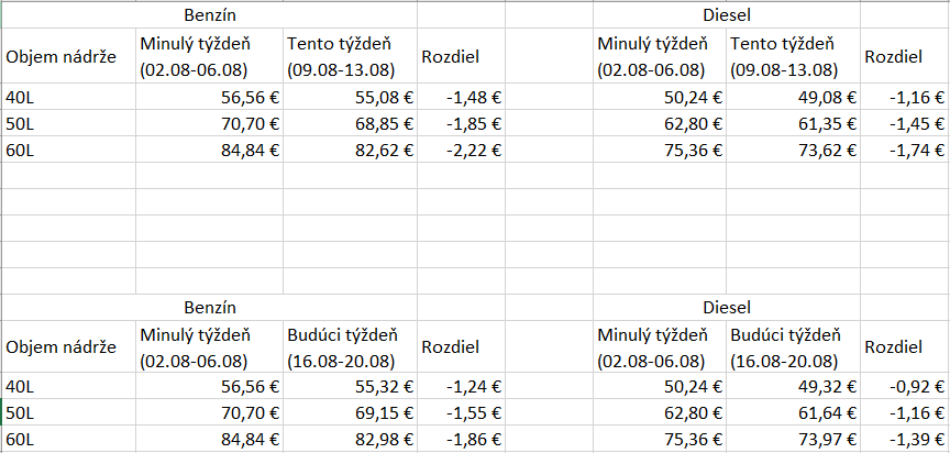Analytik spoločnosti X-Trade Brokers, Lukáš Lipovský, na základe vývoja cien PHM v Rotterdame očakáva, že priemerné ceny benzínu a dieslu na Slovensku by mali v nasledujúcich dvoch až troch týždňoch zaznamenať pokles od troch do piatich centov za liter oproti priemerným cenám z predchádzajúceho týždňa. Priemerné ceny benzínu a dieslu sa na Slovensku behom minulého týždňa nezmenili.