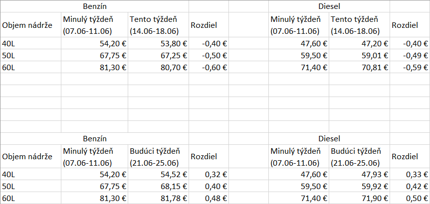Analytik spoločnosti X-Trade Brokers, Lukáš Lipovský, na základe vývoja cien PHM v Rotterdame očakáva, že priemerné ceny benzínu a dieslu by mali byť v neslujúcich dvoch až troch týždňoch stabilizované. Priemerné ceny benzínu a dieslu zaznamenali behom minulého týždňa pokles o 0,1 centu za liter oproti priemerným cenám z predchádzajúceho týždňa.