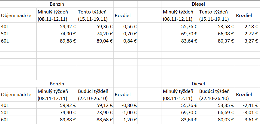 Cena ropy Brent zaznamenala v priebehu posledných týždňov pokles z lokálnych maxím o približne päť percent. Takéto poklesy sú však do istej miery bežné po prudkých nárastoch (keďže cena ropy Brent zaznamenala od septembra nárast o viac ako 30 percent), a preto je zatiaľ rastový trend cien ropy stále v platnosti. Vodiči si však budú môcť v nasledujúcich týždňoch vydýchnuť, pretože ceny PHM na Slovensku by mali byť stabilizované, resp. môžu zaznamenať mierny pokles. Avšak jedná sa len o krátkodobý scenár, pretože v prípade, ak v nasledujúcich týždňoch uvidíme nárast cien čierneho zlata, rast cien pohonných hmôt na našich čerpacích staniciach môže zaznamenať v decembri opätovné oživenie.