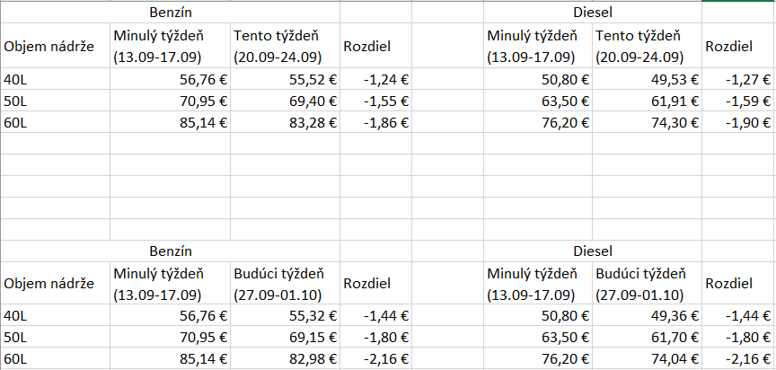 Analytik spoločnosti X-Trade Brokers, Lukáš Lipovský, na základe vývoja cien PHM v Rotterdame očakáva, že priemerné ceny benzínu a dieslu na Slovensku by mali v nasledujúcich dvoch až troch týždňoch zaznamenať pokles od jedného do dvoch centov za liter oproti priemerným cenám z predchádzajúceho týždňa. Priemerné ceny benzínu a dieslu zaznamenali na Slovensku behom minulého týždňa nárast o 0,2 centu za liter oproti priemerným cenám z predchádzajúceho týždňa.
