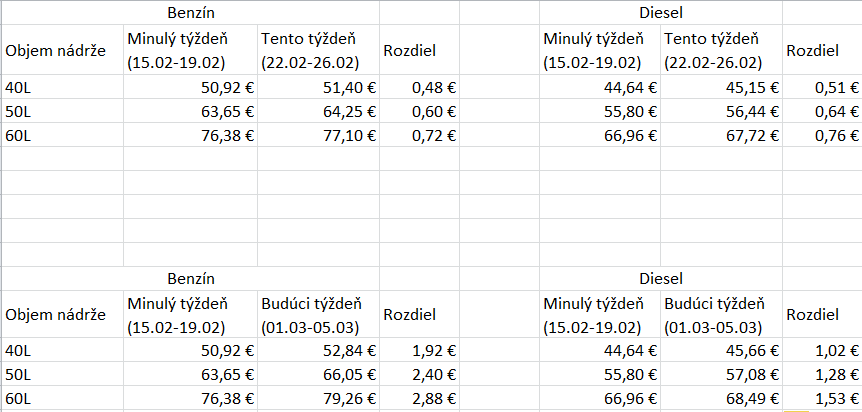 Analytik spoločnosti X-Trade Brokers, Lukáš Lipovský, na základe vývoja cien PHM v Rotterdame očakáva, že ceny benzínu a dieslu by mali zaznamenať v priebehu dvoch až troch týždňov nárast od troch do piatich centov za liter oproti priemerným cenám z predchádzajúceho týždňa. Priemerné ceny benzínu na Slovensku sa behom minulého nížili o 0,3 centu za liter, pričom priemerné ceny dieslu sa oproti priemerný cenám z predchádzajúceho týždňa zvýšili o 2 centy.
