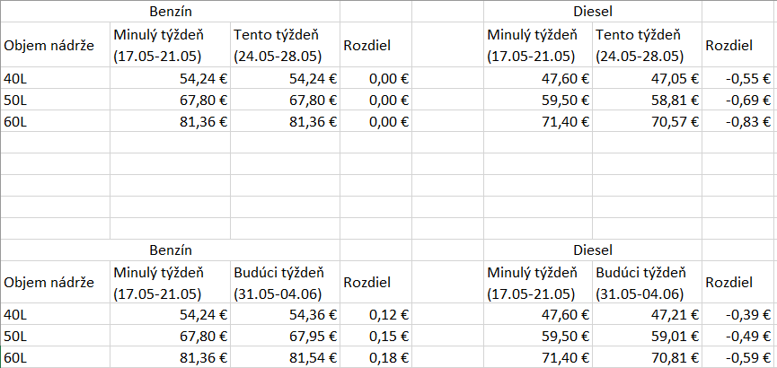 Analytik spoločnosti X-Trade Brokers, Lukáš Lipovský, na základe vývoja cien PHM v Rotterdame očakáva, že priemerné ceny benzínu by mali byť v neslujúcich dvoch až troch týždňoch stabilizované, pričom priemerné ceny dieslu na Slovensku by mali zaznamenať v nasledujúcich dvoch až troch týždňoch pokles do jedného centu za liter oproti priemerným cenám z predchádzajúceho týždňa. Priemerné ceny benzínu zaznamenali behom minulého týždňa nárast o 0,2 centu za liter, pričom priemerné ceny dieslu vzrástli o 1,5 centu za liter oproti priemerným cenám z predchádzajúceho týždňa.