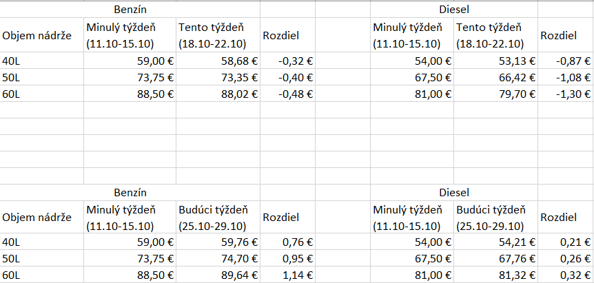 Analytik spoločnosti XTB, Lukáš Lipovský, na základe vývoja cien PHM v Rotterdame očakáva, že priemerné ceny benzínu a dieslu na Slovensku by mali v nasledujúcich dvoch až troch týždňoch zaznamenať nárast od troch do šiestich centov za liter oproti priemerným cenám z predchádzajúceho týždňa. Priemerné ceny benzínu zaznamenali na Slovensku behom minulého týždňa nárast o 2,6 centu za liter, pričom priemerné ceny dieslu zaznamenali nárast o 2,4 centu za liter oproti priemerným cenám z predchádzajúceho týždňa.