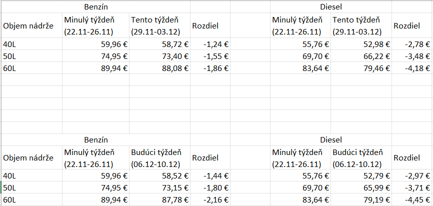 Analytik spoločnosti XTB, Lukáš Lipovský, na základe vývoja cien PHM v Rotterdame očakáva, že priemerné ceny benzínu a dieslu na Slovensku by mali v nasledujúcich dvoch až troch týždňoch zaznamenať pokles od troch do šiestich centov za liter oproti priemerným cenám z predchádzajúceho týždňa. Priemerné ceny benzínu a dieslu zaznamenali na Slovensku behom minulého týždňa pokles o 0,1 centu za liter oproti priemerným cenám z predchádzajúceho týždňa.