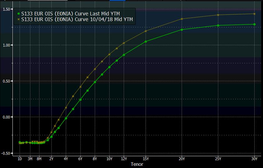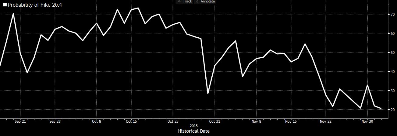 Vyzerá to, že trhy na očakávania, že ECB začne dvíhať sadzby v lete budúceho roka rezignovali. Implikovaná pravdepodobnosť (vychádzajúca z vývoja na swapových trhoch) zvýšenia sadzieb do septembra 2019 je aktuálne len 20%. Ešte pred dvoma týždňami sa pritom hýbala okolo 50%.